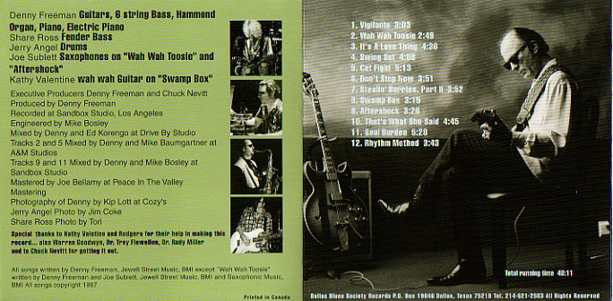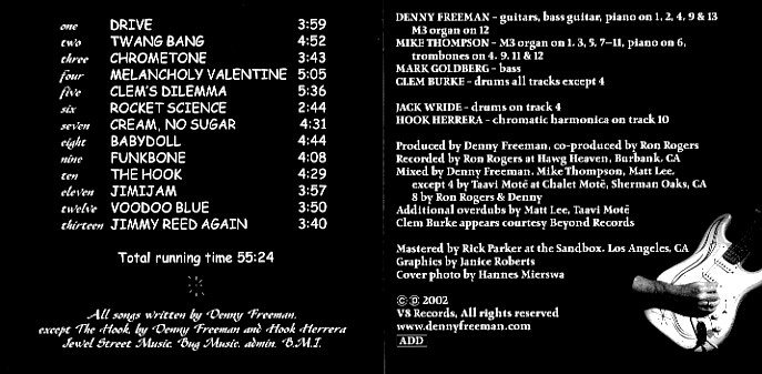 "Twang Bang" contains 13 new instrumentals, all written by Denny, except "The Hook", by Denny and Hook Herrera which features Hook on chromatic harmonica. It features Denny's regular bass and keyboard players, Mark Goldberg and Michael Thompson, and Clem Burke (Blondie) on drums. Mike also does great work on trombones on four tunes. The music is a gumbo of blues, jazz, a little rock 'n roll, and a couple of ballads. Denny plays guitar, bass guitar, piano and organ.